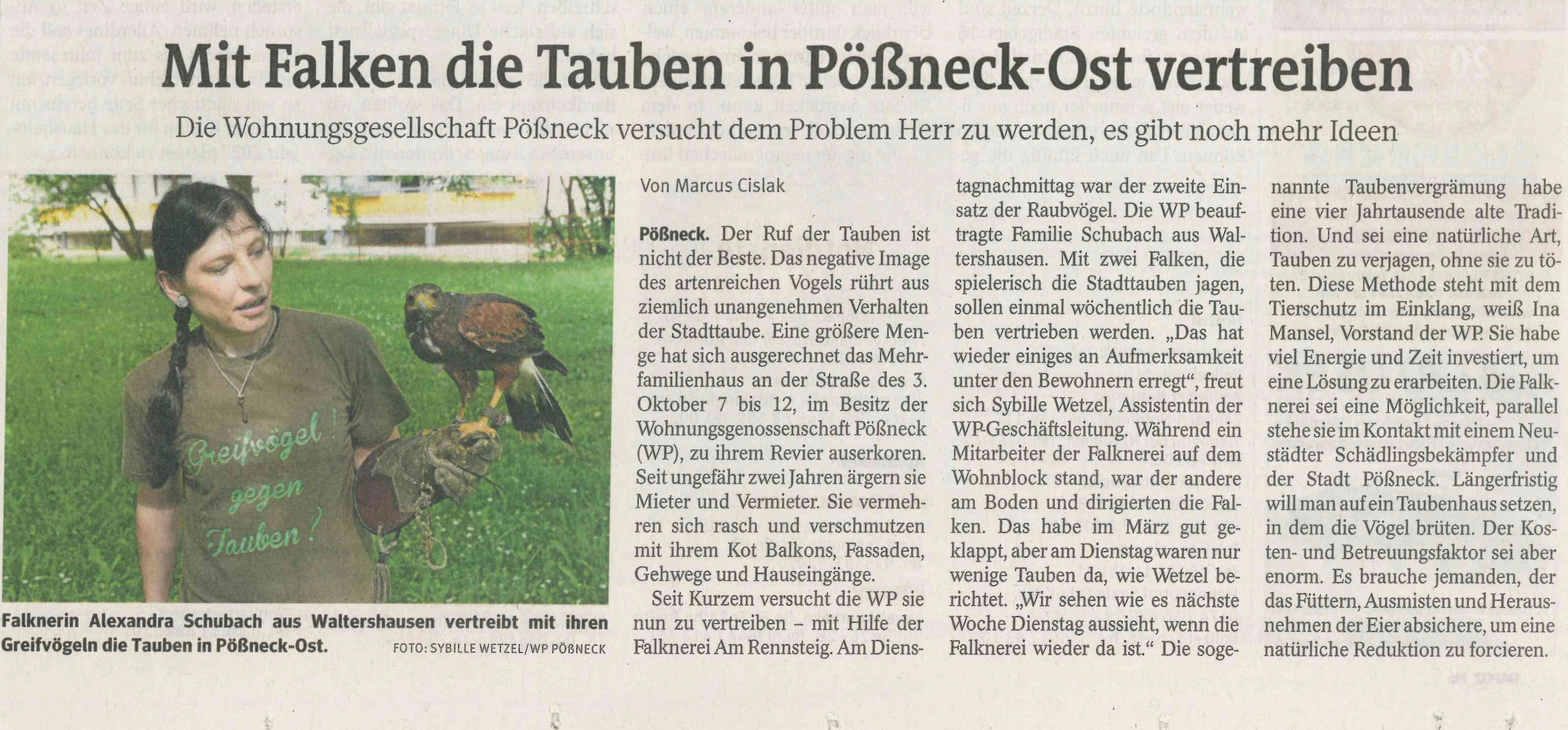 Aktuell arbeiten wir verstärkt an der Vergrämung der Tauben aus Pößneck Ost. Unterstützung bekommen wir hierbei von der Falknerei Schubach aus Waltershausen, die mit Ihren Greifvögeln das Problem angeht. Zwei Einsätze wurden schon durchgeführt und sorgten für Aufsehen. Am 10. Juni 2021 berichtete die OTZ (siehe Anhang) und auch das MDR-Fernsehen hat sich schon eingeschaltet und möchte den nächsten Einsatz der Greifvögel filmen.